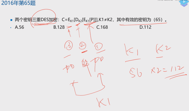 3DES当k1与k3相同(一般情况下),密钥长度为56*2=112位。其他两种情况密钥可能为56、168.