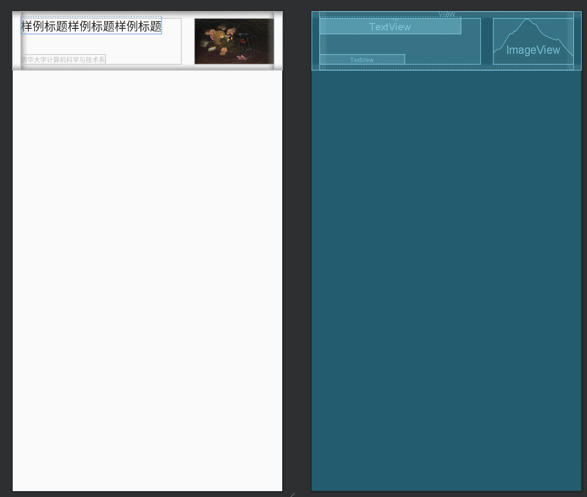 得到的布局如下图,如你所见,前后两个 View 是上下占位边框,中间的部分是一组横向线性排列,权重为 2:1;左边是两个文本框组成的,右边是一张图片。布局文件的编写还是比较直观的,更多地需要在实践中提高使用的熟练度,这里不再赘述。