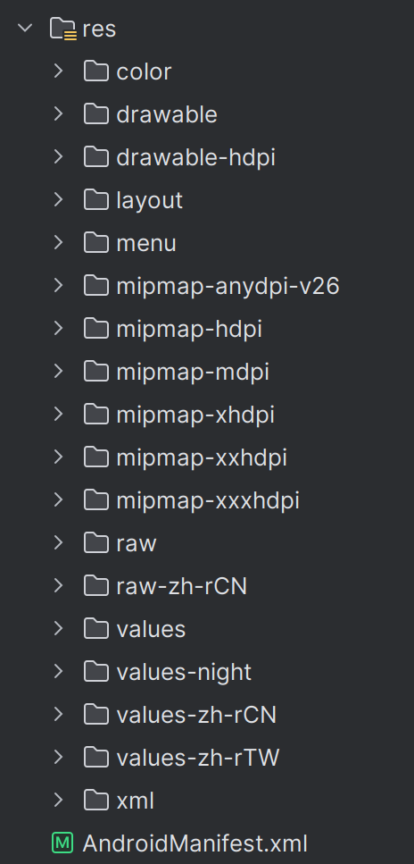 Android 的资源库存储着 APP 的本地资源,包括布局文件、图片、音频、字符串、颜色等内容,这些资源使用 XML 语法编写,被存储在项目文件的 res 目录下,在 APP 运行时可以被调用。
