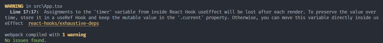 这个警告告诉我们,timer 作为函数内部变量,会随着渲染结束(函数执行完毕)而消失,如果需要将其持久化,需要使用另外一个 useRef Hooks。