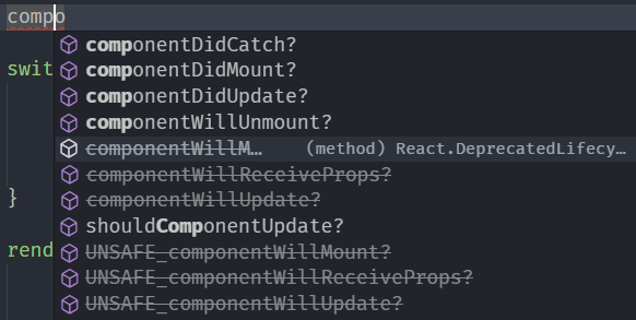 我们可以注意到 componentWillMount() 等方法已经被标记为 Deprecated,这是因为这类方法往往可能会在组件未构建完毕或者更新完毕的时候修改组件,这是有数据竞争危险的。所以在 React 17/18 版本的过渡之中,这些方法会被废弃。这些生命周期方法包括: