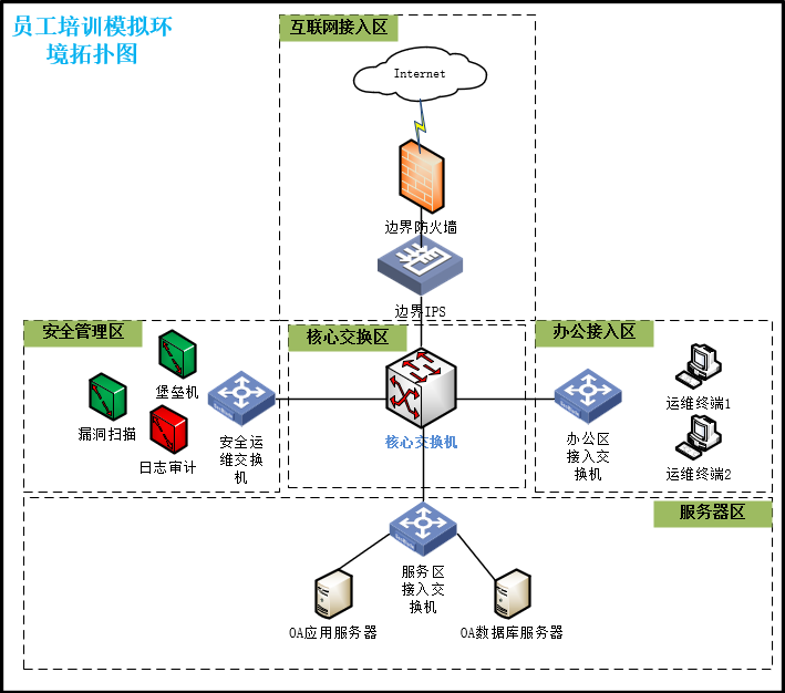 整体网络划分为互联网接入区、安全管理区、服务器区、核心交换区、办公接入区。相关安全策略如下:
