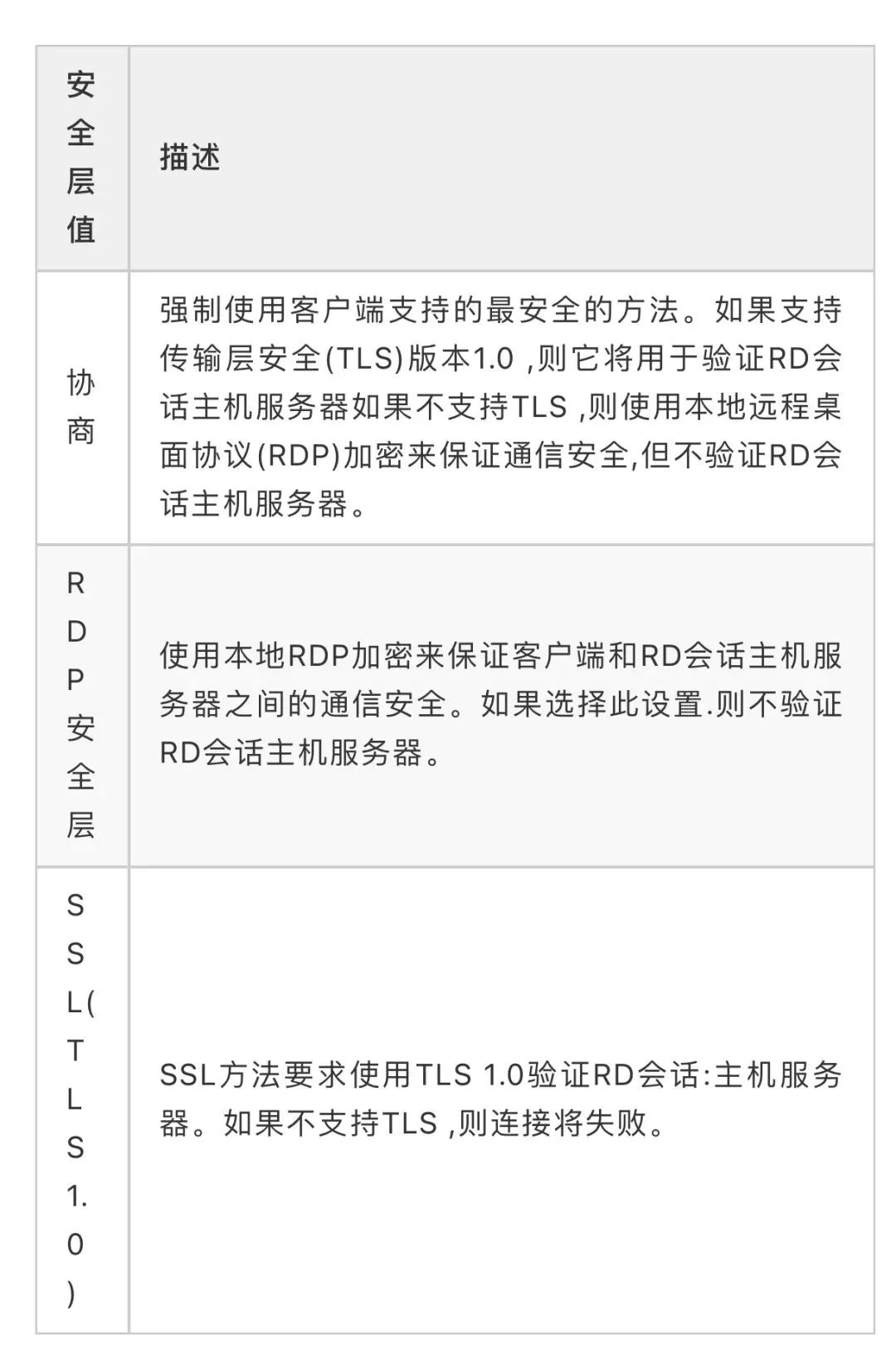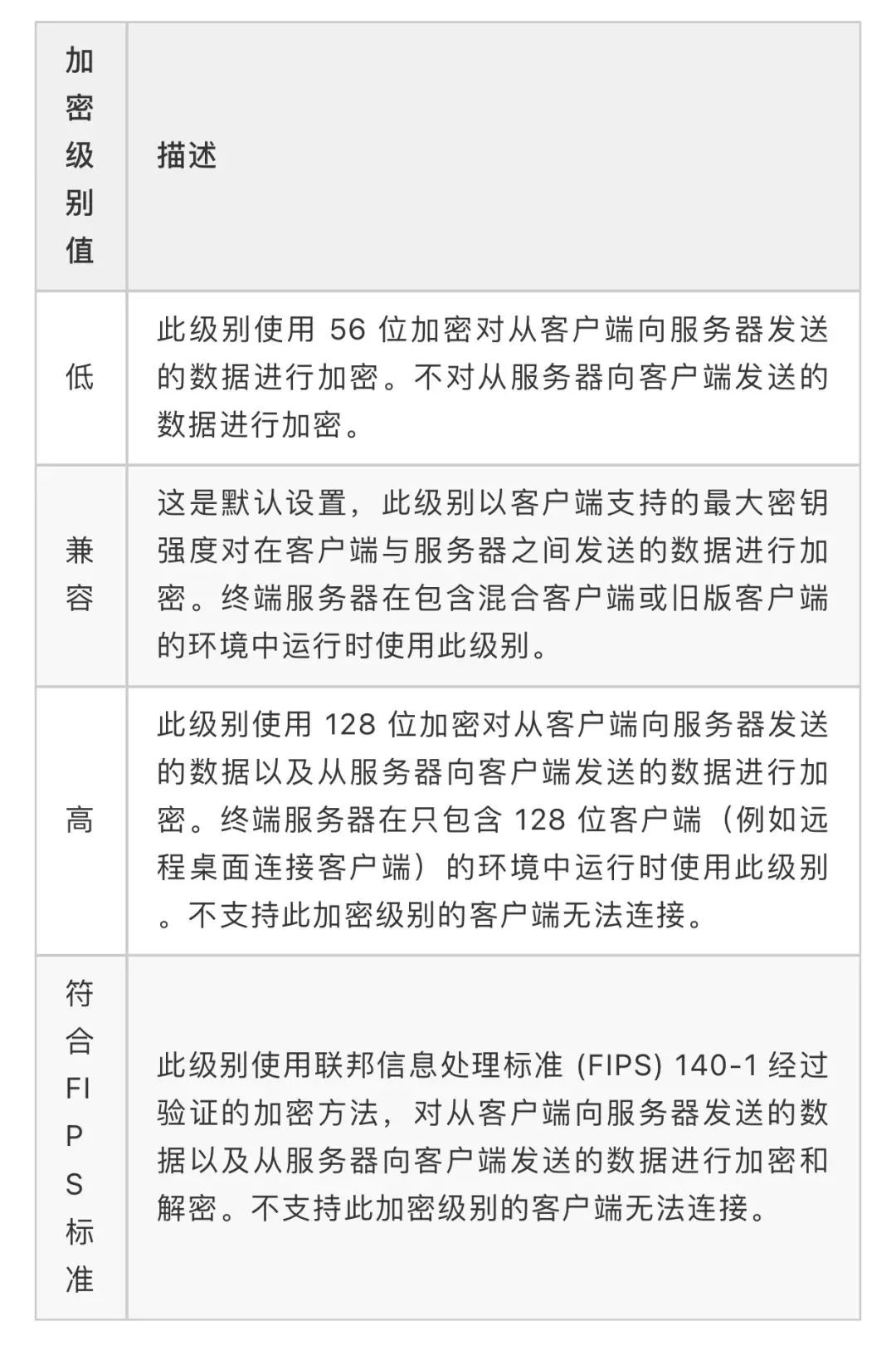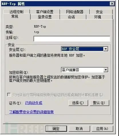 1)Windows远程桌面RDP是否符合传输过程中的保密性?笔者查过相关资料,Windows的RDP安全主要有安全层和加密级别两个参数,其中安全层有RDP安全层、协商和TLS1.0共3个值,其中默认值是协商。