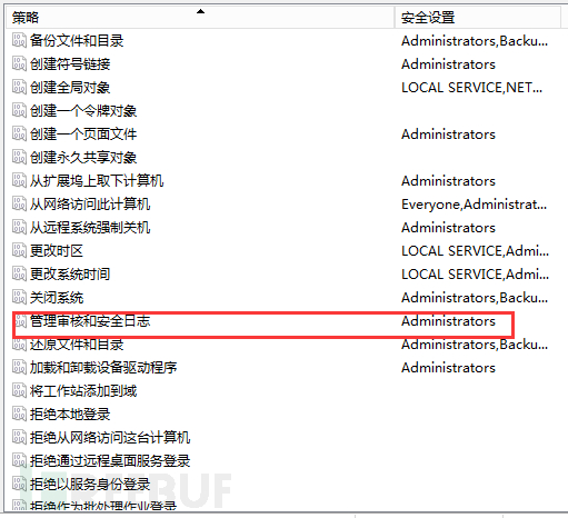 通过输入secpol.msc–》本地策略–》用户权限分配,查看“管理审核和安全日志”策略项是否包含了与审计无关的用户组(默认符合)