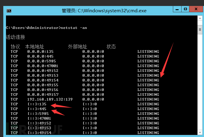 通过运行–》cmd–》netstat -an,查看高危端口开启情况(例如135,137,138,139,445,3389等)