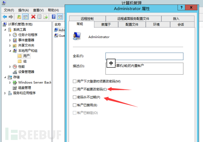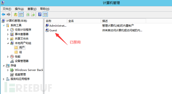 通过查看 控制面板–》程序与系统–》管理工具–》计算机管理–》用户与用户组或者运行中输入lusrmgr.msc,查看有哪些用户,系统默认用户adminstrator和Guest,Guest默认禁用,administrator不存在默认口令。