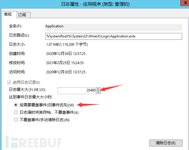 Windows操作系统默认除了administrators组外不能删除修改日志,所以需要检查应用程序、安全、系统日志策略是否合理,关注点如下图(下图是默认配置):