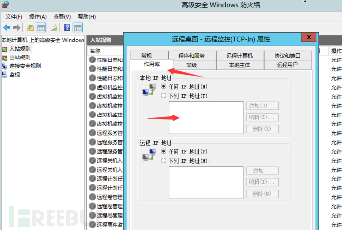 通过运行-》firewall.cpl-》高级设置-》入站规则-》远程桌面-》用户模式(Tcp-In)-》作用域(默认未配置),先查看主机防火墙是否开启。