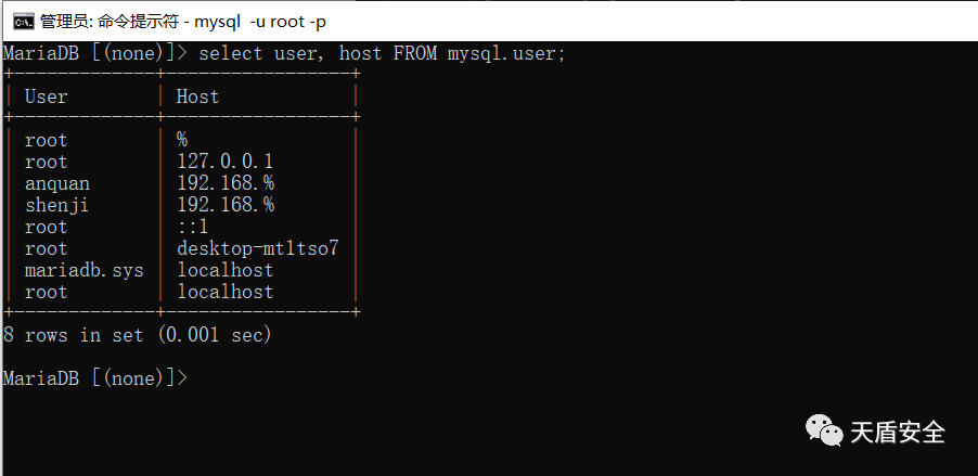 查看用户登录的IP地址;是否给所有用户加上IP限制,拒绝所有未知主机进行连接,当user表中的Host值不为localhost时,应指定特定IP地址,不应为%;或将user表中的Host值为空,而在host表中指定用户账户允许登录访问的主机IP,使在非信任的客户端(其他地址)以数据库账户登录时被拒绝访问。