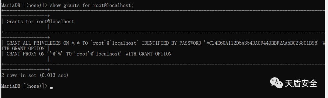 执行命令“show grants for root@localhost;”查看用户登录的IP地址;是否给所有用户加上IP限制,拒绝所有未知主机进行连接。