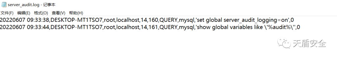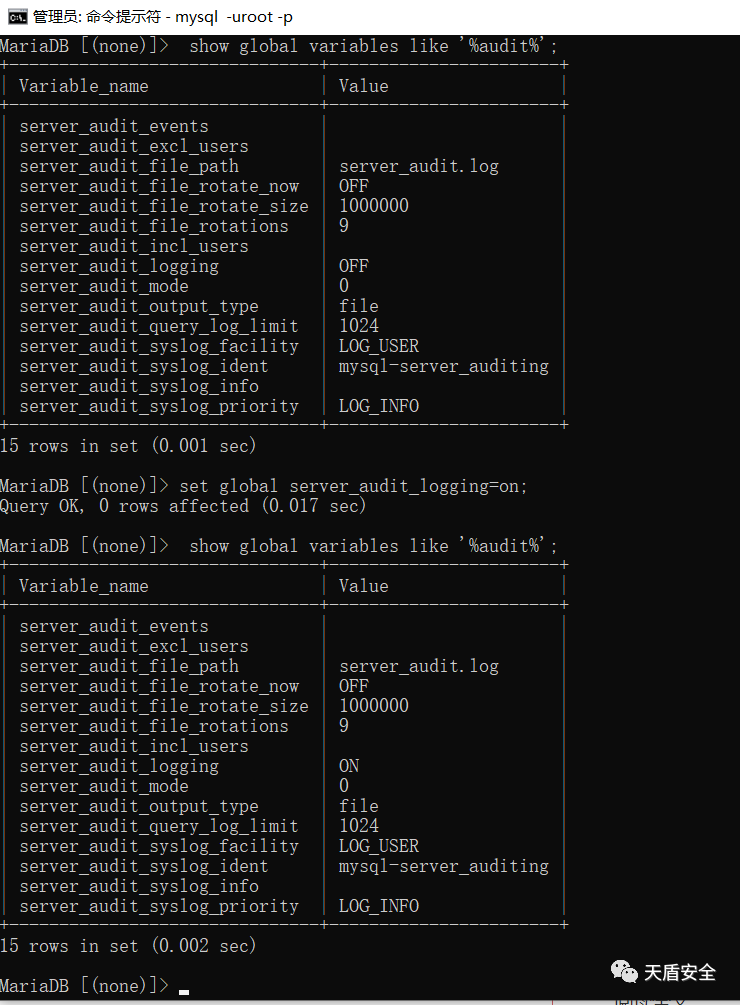 1)执行命令::show global variables like ‘%audit%’;“检查审计是否开启,如果未开启建议执行命令:“set global server_audit_logging=on;”开启审计。