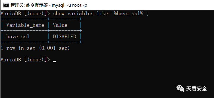 2)远程管理根据实际管理情况进行判定(如了解数据库管理工具采用什么措施防止鉴别信息在传输过程中被窃听),若存在远程管理,执行命令:“show variables like ‘%have_ssl%’;”查看是否启用ssl协议,并验证协议是否生效: