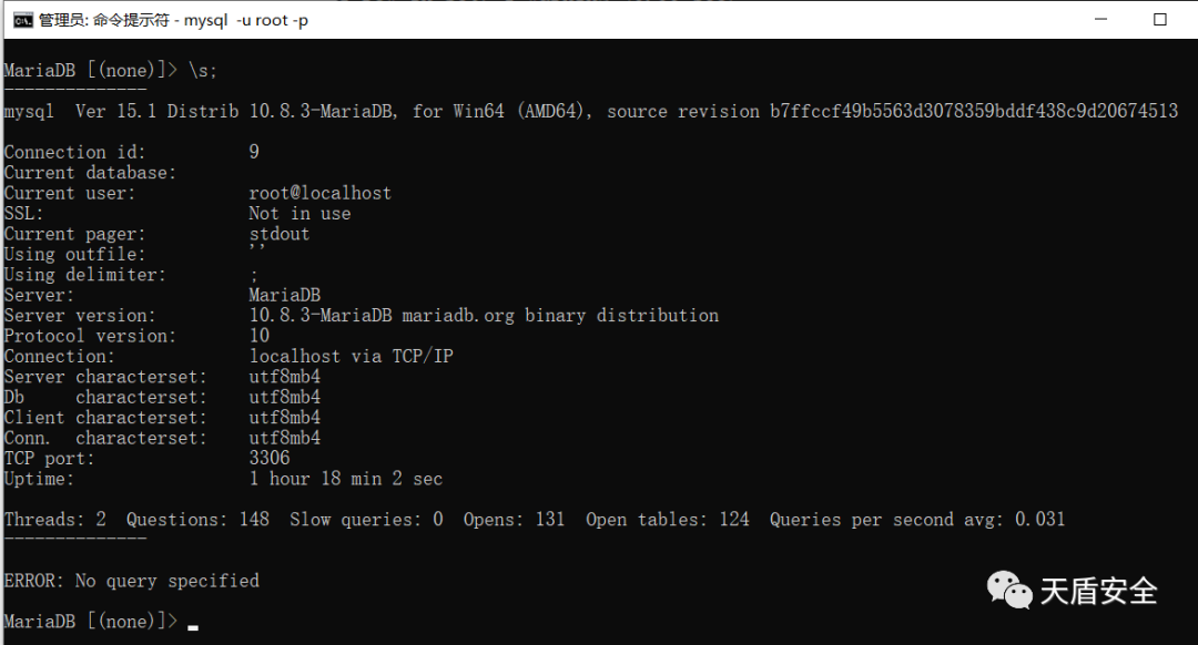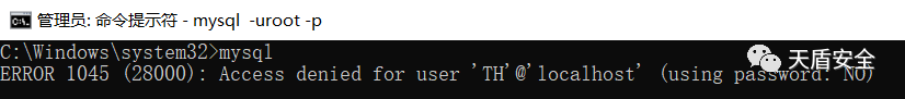 1)执行命令:“mysql"检查数据库是否对用户进行身份鉴别:
