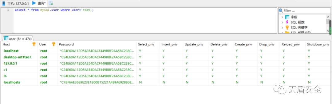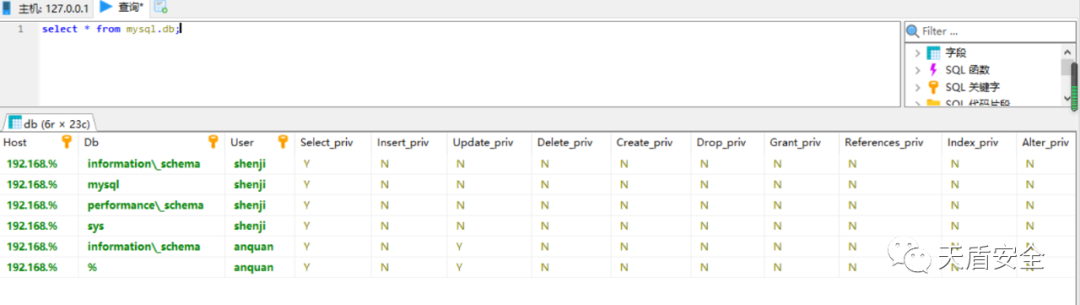 1)执行命令:”select * from mysql.user where user=‘XXX’;或“select * from mysql.db;”检查用户权限: