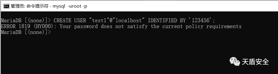 4)执行命令:“CREATE USER “test1”@”localhost” IDENTIFIED BY ‘123456’;若不存在空口令、弱口令的现象: