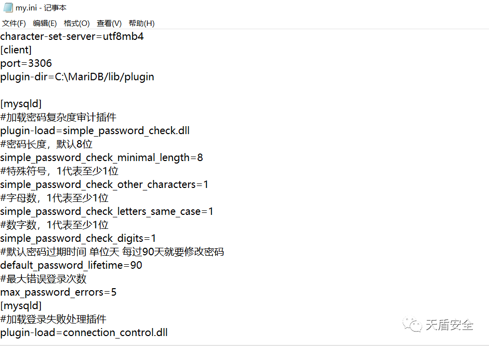 2)在数据库“my.ini”配置文件修改口令策略参数。