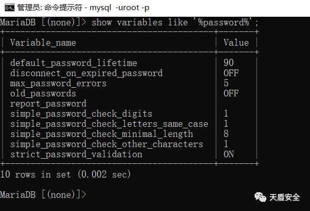 备注:如果数据库未安装密码策略插件请执行命令:“INSTALL SONAME ‘simple_password_check’;”进行安装并配置相关策略。