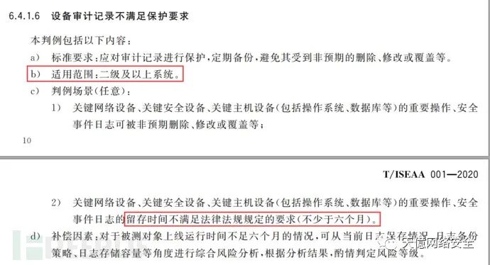 同时需要确定留存的日志时间,是否达到了法律法规要求(至少六个月),该条在《网络安全等级保护测评高风险判定指引》中有过说明。