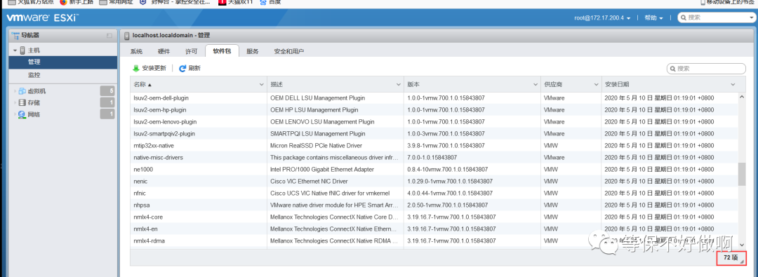 ## **四、入侵防范** ### **1. 应遵循最小安装的原则,仅安装需要的组件和应用程序** web界面:主机→管理→软件包默认情况下该版本安装了72项软件包,大部分为驱动程序、管理插件、组件间的支持程序、支持库等。