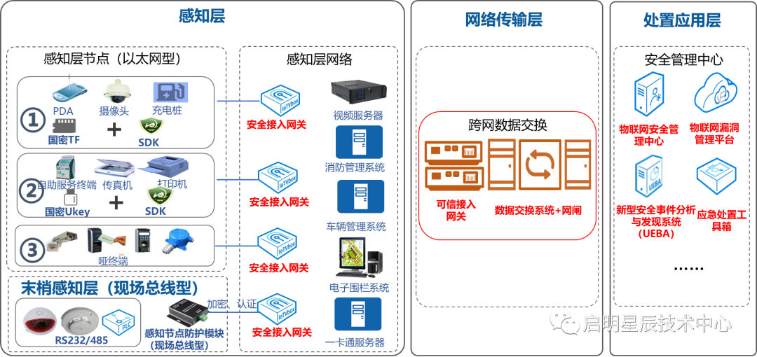 02、 物联网感知层、网络传输层和处理应用层的三层架构进行物联网综合安全防护设计;