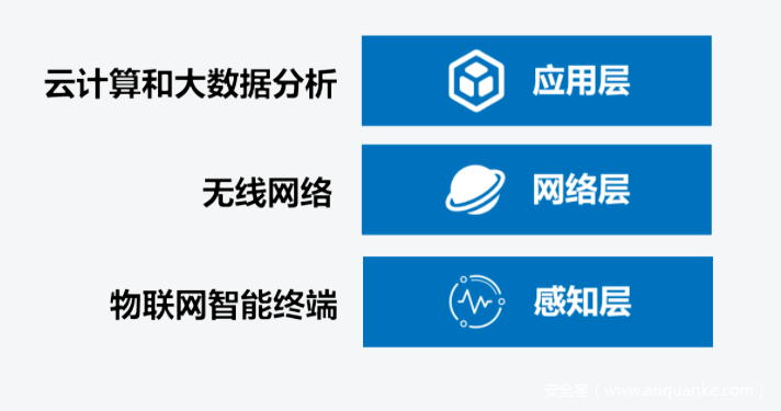 物联网通常由3层架构组成,由下到上依次为感知层、网络层、应用层。通俗的来讲,分为端、管、云三部分: