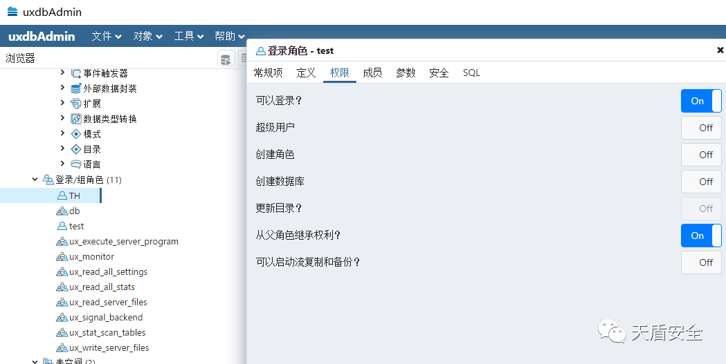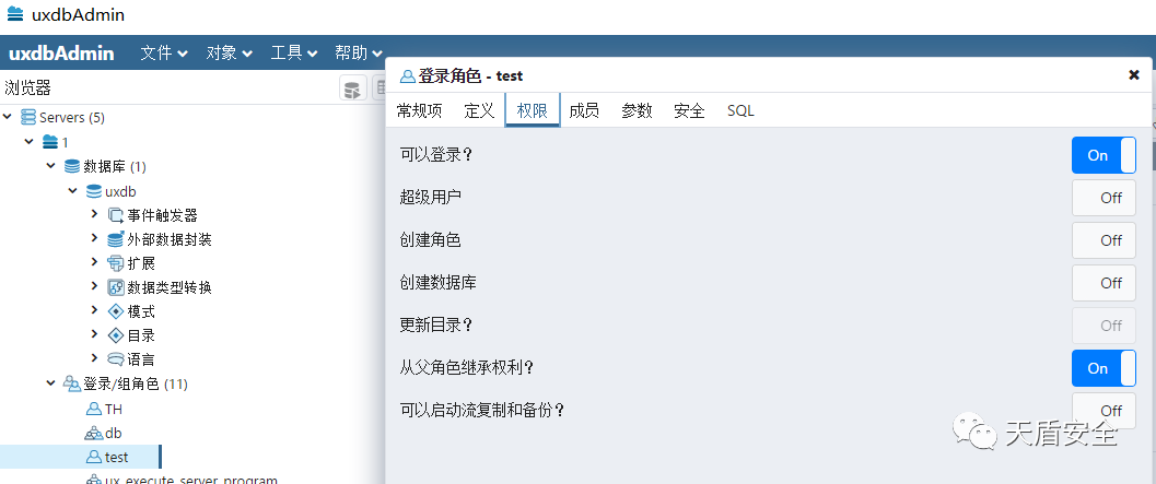 2)查看管理员权限;(此测评点如果数据库已经启用身份鉴别,且具备权限分离可判定为符合)