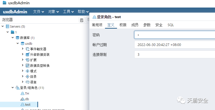 优炫数据可配置连接限制,此连接限制是指用户登录失败三次锁定账户,需要管理员进行解锁,解锁方式:如下图的可以登录项的off修改为on,无登录超时自动退出措施。