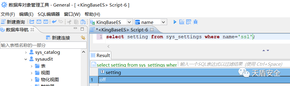 2)远程管理根据实际管理情况进行判定(如了解数据库管理工具采用什么措施防止鉴别信息在传输过程中被窃听),若存在远程管理,执行命令:“select setting from sys_settings where name=‘ssl’;”查看是否启用ssl协议,并验证协议是否生效: