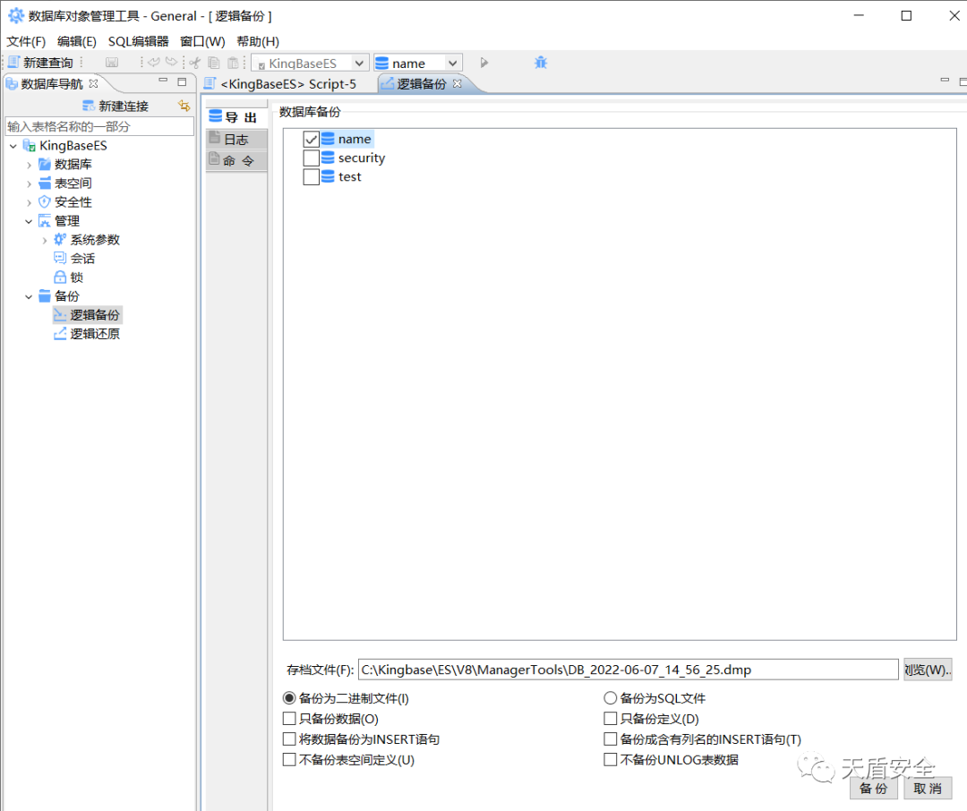 可以通过数据库管理工具进行备份,如KingbaseES自带的逻辑备份。