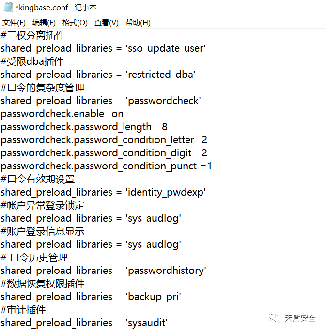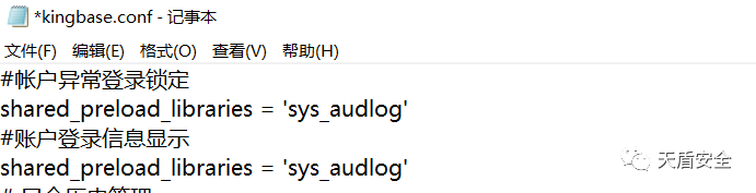 1)KingbaseES 通过插件的方式来进行登录失败处理管理,修改 kingbase.conf 文件中 shared_preload_libraries 参数后重启数据库。