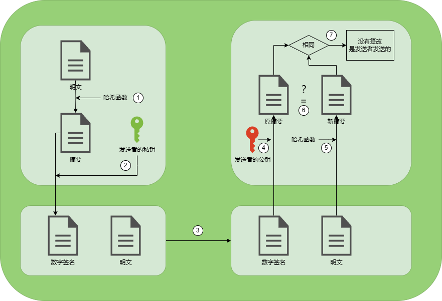- 接收者对比解密出的原摘要和自己计算出的新摘要;