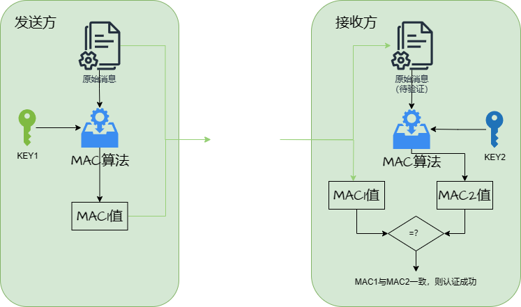 - 接收者根据收到的原始消息计算MAC2(使用密钥KEY2);