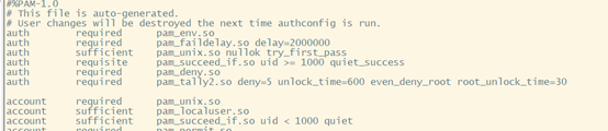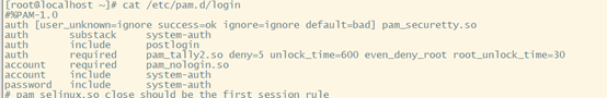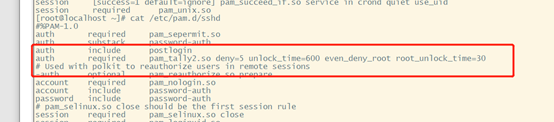 中分别添加auth required pam_tally2.so deny=5 unlock_time=600 even_deny_root root_unlock_time=30