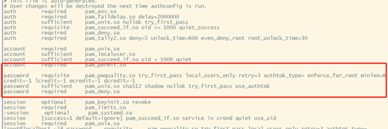 在/etc/pam.d/system-auth文件中password requisite pam_pwquality.so try_first_pass local_users_only retry=3 authtok_type= 后添加