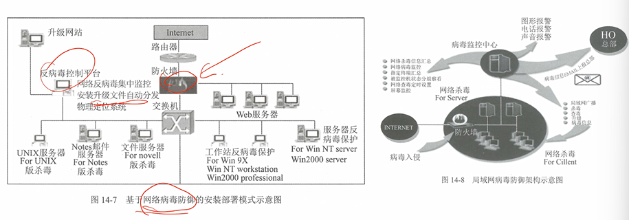 终端杀毒、管理平台(可与广域网总部联络更新分发到终端)、防火墙