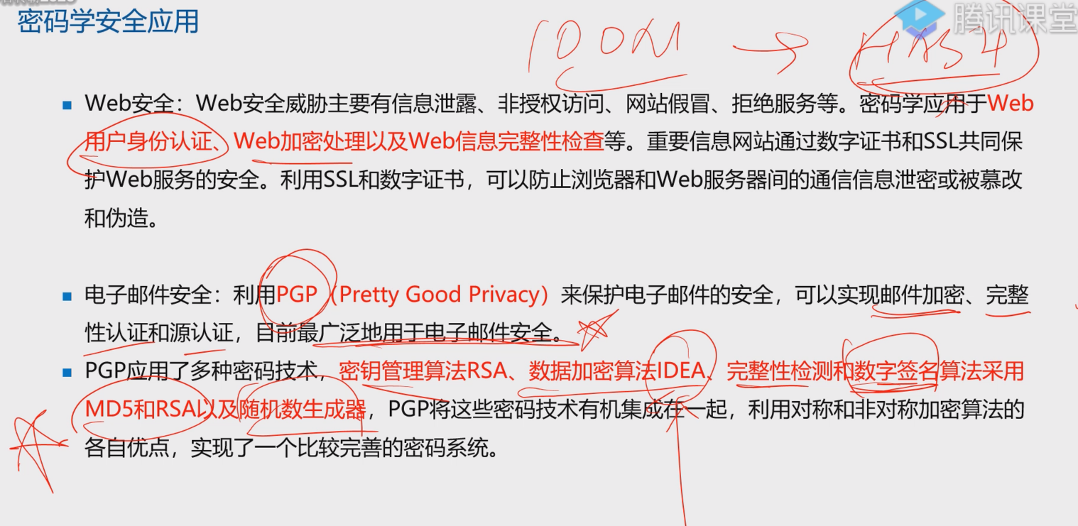 RSA非对称、IDEA对称(明文和密文分组64,密钥128)、MD5哈希(输入512,生成128)、