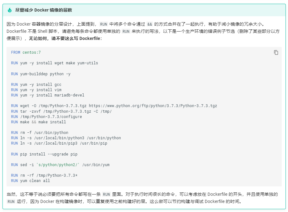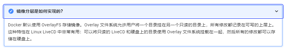 Docker 在根据 Dockerfile 构建时,会从上到下执行这些指令,每条指令对应镜像的一层。Docker 容器镜像的独特之处就在于它的分层设计:在构建镜像时每层的更改会叠加在上一层上(这意味着,上一层的所有数据仍然会保留,即使在新的一层删除了);如果某一层已经存在,Docker 会直接使用这一层,节约构建的时间和占用的空间。